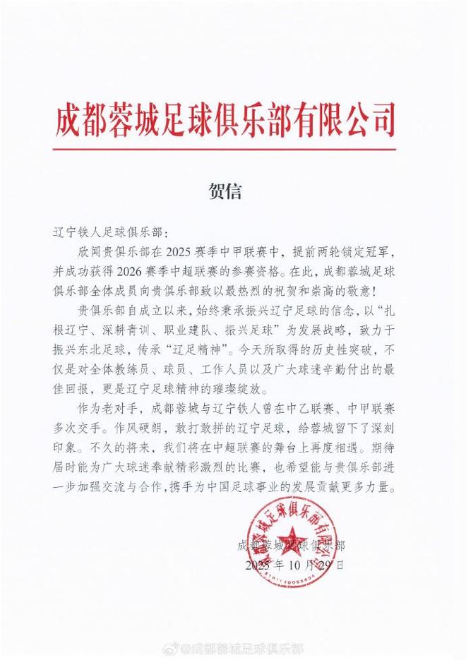北京时间10月29日,成都榕城提前两场过关中超,向夺得中甲联赛冠军的辽宁铁人发来贺信。辽宁铁人足球俱乐部贺信:很高兴得知贵队提前两轮获得2025年中甲联赛冠军,获得2026年中超联赛参赛资格。成都蓉城足球俱乐部全体队员谨向贵俱乐部致以诚挚的祝贺和崇高的敬意。贵俱乐部自成立以来,始终坚持振兴辽宁足球的信念,确立了“扎根辽宁、深耕青少年、组建职业队伍、振兴足球”的发展战略。我们为振兴东北足球而努力,传承“辽足精神”。今天取得的历史性进步,不仅是对全体人民努力的最好回报教练、球员、工作人员、球迷,更是辽宁足球精神的光辉绽放。成都成都与辽宁铁人是中甲联赛和中甲联赛中多次交锋的老对手。辽足以硬朗的作风和硬朗大胆的打法给成都留下了深刻的印象。期待不久的将来,我们能在中超联赛的舞台上再次见到你们。我们期待为我们的粉丝带来激动人心、激烈的比赛。我们也希望进一步加强与贵俱乐部的交流与合作,共同为中国足球的发展做出贡献。