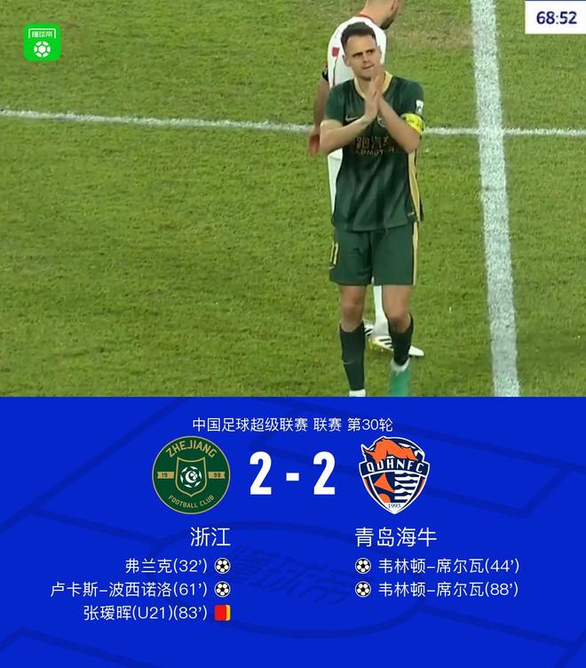 北京时间11月22日,中超联赛第30轮浙江队主场迎战青岛海宇。在卢卡斯·波西诺洛的贡献下,弗兰克在告别赛中打进的+2进球被判无效。威灵顿·席尔瓦为球队两粒扳平进球做出贡献,张爱辉两张黄牌一张红牌被罚下场。最终比分是浙江2-2青岛海牛,青岛海牛成功保级。重要比赛第32分钟,告别赛进球!弗兰克头球破门,浙江队1-0领先,进球数达到50个大关。第44分钟,比分追平。威灵顿·席尔瓦进球。海牛1-1。第60分钟,他们再次取得优势。卢卡斯头球破门,浙江队2-1领先。第88分钟,威灵顿·席尔瓦凭借个人技术征服了世界。进球被破,马纳蒂2-2的伟大时刻。双方球员均参加了比赛。两英里进入比赛后,他们浪费了一次机会。第12分钟,奥乌苏射门偏出。他越位了。弗兰克的进球是在第26分钟决定的。错失良机。奥乌苏脚下一滑,射门偏出。第32分钟,告别赛进球!弗兰克头球破门,浙江队1-0领先,进球数达到50个大关。第36分钟关键扑救。查子维的威胁射门被赵博扑出。第41分钟,米特里策射门远角,但皮球偏出。第44分钟,比分追平。第5分钟,惠灵顿席尔瓦进球,海牛队1-1。两分钟后,奥乌苏禁区内倒地。主裁在查看VAR后并未判罚点球。第56分钟,浙江队球员率先手球犯规。随后弗兰克的进球被判无效。第60分钟,他们再次取得优势。卢卡斯头球破门。第70分钟,浙江队2-1领先,结束告别赛!在第83届第分钟,浙江队队长弗兰克被替换下场时,张爱辉犯规,领到第二张黄牌被罚下场。第88分钟,惠灵顿·席尔瓦凭借个人技术打进一粒举世闻名的进球。海牛队以2-2战胜米格队观看中超联赛。支持主队!球队阵容技术统计